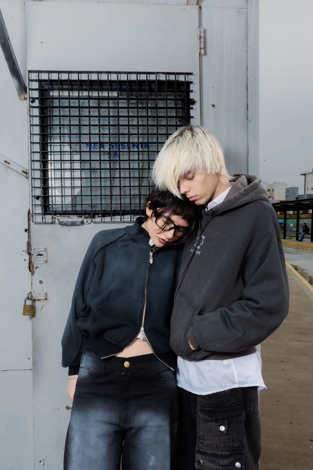 campera de frisa 80% algodón 20% poliéster. recorte varios, costuras al revés. puños, cintura y cuello tejidos. estampado en serigrafía en la espalda. logo y firma bordados en el frente. cierre doble camino ykk con tiracierres personalizado fundido en zamak. lavado tipo sunfade de gris a negro.