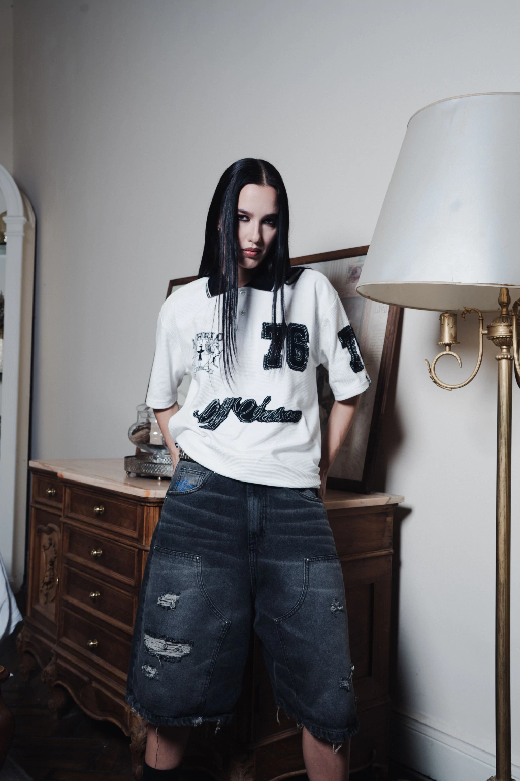 Bermuda de jean baggy confeccionada en denim black 11.8 oz importado. Parche en las rodilas, lavado con numerosos detalles, manchas blancas de pintura en la parte trasera, roturas a mano en la boca de los bolsillos traseros y delanteros, frente y botamangas. Etiqueta de cuero en la parte trasera. Bordado en el bolsillo relojero y en el bolsillo trasero. Botón personalizado en Zamak, tachas metálicas.