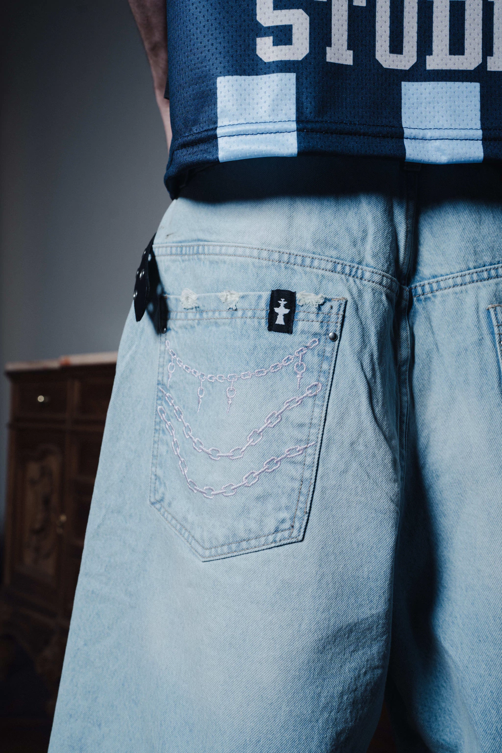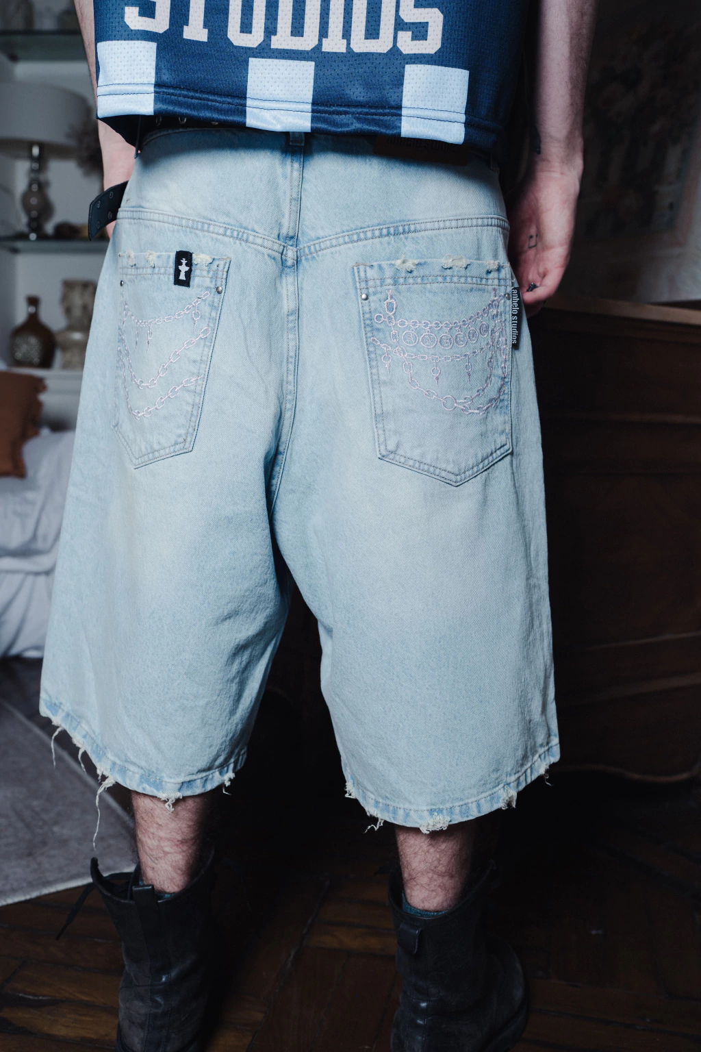 Bermuda de jean baggy confecionada en denim blue 12 oz importado. Detalles de lavado, roturas a mano en la boca de los bolsillos delanteros y traseros y en la botamanga. Etiqueta de cuero en la parte trasera. Bordados en ambos bolsilos traseros y en el relojero. Botón personalizado en Zamak, tachas metálicas.