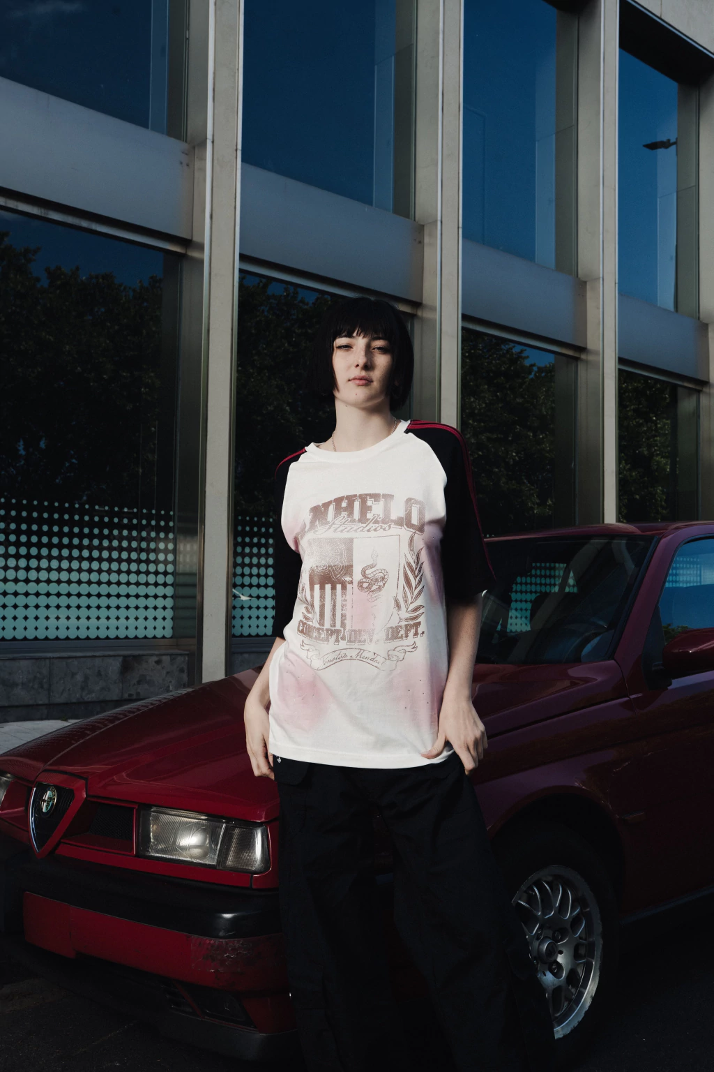 Remera ranglan de corte oversize confeccionada en jersey 100% algodón 24.1. Estampado en serigrafía de alta densidad en el frente. Tiras deportivas en los hombros. Etiquetas de marca en la manga y en el lateral. Efecto localizado y lavado industrial. Strass en el frente.