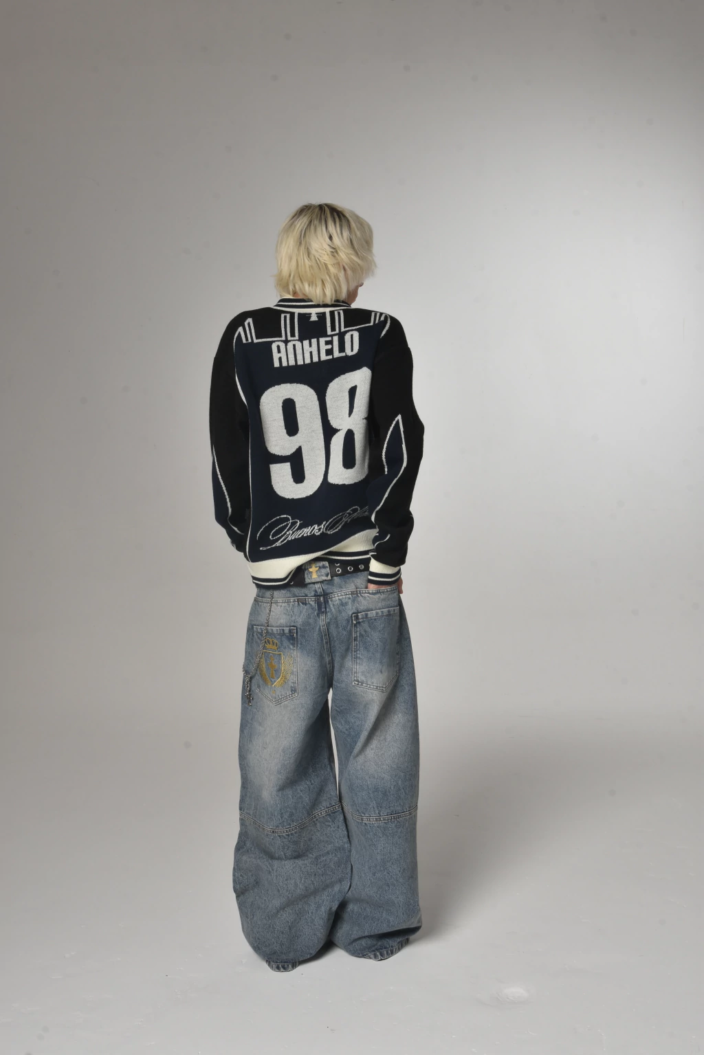 Sweater de corte boxy fit tejido 100% en lana acrílica premium triple capa. Diseño en jacquard completo, cuello polo con cartera, ojales y botones teñidos al tono. Confección premium, unión del cuello remallada.