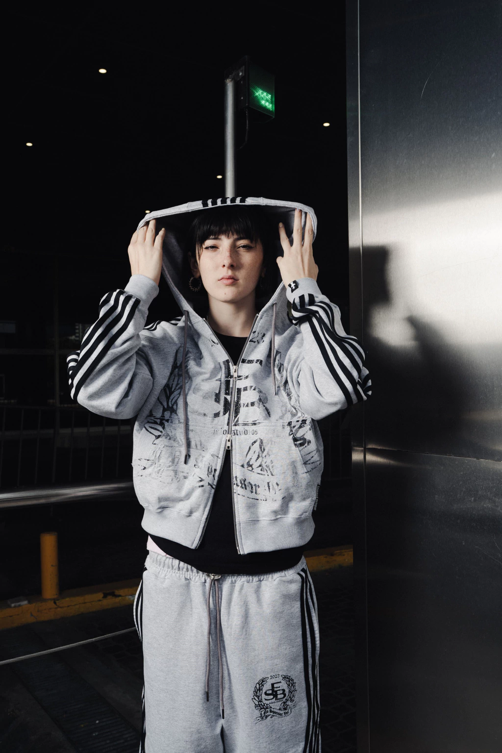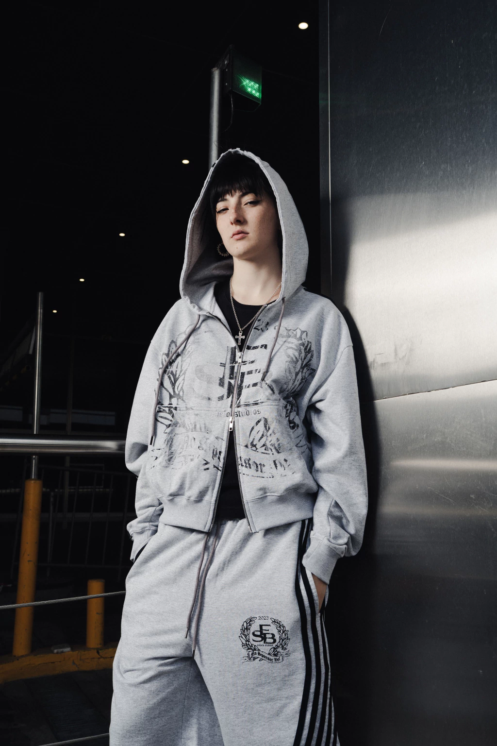 Campera de corte boxy confeccionada en rústico 100% algodón. Tiras aplicadas en las mangas, capucha y espalda. Etiquetas de marca en el frente y en el puño. Ribb en el bolsillo delantero. Cierre doble camino YKK. Cordones de algodón y ojalillos de niquel. Estampado en serigrafía efecto cracked en el frente.